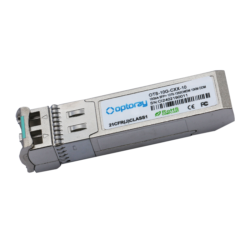 Az OTS-10GXXX sorozatú egymódusú adó-vevő egy kis méretű csatlakoztatható modul kétirányú soros optikai adatkommunikációhoz, mint például az IEEE 802.3ae 10GBASE-LR/LW. 20 tűs SFP csatlakozóval rendelkezik, amely lehetővé teszi a bekapcsolást. A digitális diagnosztikai funkciók I2C-n keresztül érhetők el. Ezt a modult egymódusú szálhoz tervezték, és a CWDM hullámhossz névleges hullámhosszán működik. Tizenhat középső hullámhossz érhető el 1270 nm és 1610 nm között, minden lépéssel 20 nm. Garantált 11 dB optikai kapcsolati költségvetést kínálunk. Az adórész CWDM többkvantumlyukú DFB lézert használ, és az IEC-60825 nemzetközi biztonsági szabvány szerint 1. osztályú lézerkompatibilis. A vevőrész egy optikai fejlécbe szerelt integrált InGaAs detektor előerősítőt (IDP) és egy korlátozó utóerősítő IC-t használ. Az adó-vevő modul megfelel a Small Form-factor Pluggable Plus (SFP) többforrású megállapodásnak (SFF-8432). Továbbfejlesztett digitális diagnosztikai felügyeleti interfész került beépítésre az SFP adó-vevőbe. Az SFF-8472. alapján a hőmérséklet, a tápfeszültség, a lézer előfeszítő áram, a lézer átlagos kimeneti teljesítménye és a vett kimeneti teljesítmény valós idejű monitorozása biztosított.
